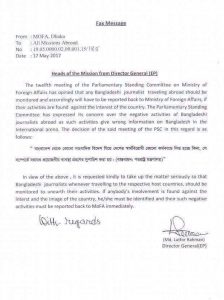 গতকাল পররাষ্ট্র মন্ত্রণালয় থেকে পাঠানো এক বিজ্ঞপ্তিতে জানানো হয়: যদি কোনো সাংবাদিক বিদেশে দেশবিরোধী কাজে লিপ্ত হন, তবে তাকে চিহ্নিত করে পররাষ্ট্র মন্ত্রণালয়ে রিপোর্ট করতে হবে।