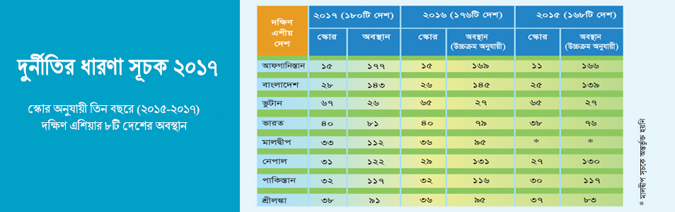 তিনি বলেন: ২০১৭ সালে বাংলাদেশ ০-১০০ স্কেলে ও অবস্থান উভয় বিবেচনায় ২০১৬ এর তুলনায় ২ ধাপ এগিয়েছে। ১০০ এর মধ্যে ৪৩ স্কোরকে গড় স্কোর হিসেবে বিবেচনায় বাংলাদেশের ২০১৭ সালের স্কোর ২৮ হওয়ায় দুর্নীতির ব্যাপকতা এখনো উদ্বেগজনক বলে মনে হয়। তাছাড়া দক্ষিণ এশিয়ার ৮টি দেশের মধ্যে বাংলাদেশের অবস্থান এখনো বিব্রতকরভাবে আফগানিস্তানের পর দ্বিতীয় সর্বনিম্ন। এশিয়া প্যাসিফিক অঞ্চলের ৩১টি দেশের মধ্যে বাংলাদেশ চতুর্থ সর্বনিম্ন অবস্থানে। অতএব, উল্লিখিত সামান্য অগ্রগতি কোনো অবস্থাতেই সন্তোষজনক নয়। তবে অনুমান করা যায় যে, বাংলাদেশের আইনী, প্রাতিষ্ঠানিক ও নীতি কাঠামো তুলনামূলকভাবে সুদৃঢ় হয়েছে এই ধারণা থেকে সূচকে বাংলাদেশের স্কোর দুই বৃদ্ধি পেয়েছে। কিন্তু প্রয়োগের ঘাটতি, ব্যাংকিং ও অর্থনৈতিক খাতসহ বিভিন্ন খাতে ক্রমবর্ধমান অনৈতিক প্রভাব বিস্তার, অনিয়ম ও দুর্নীতি ও বিশৃংখলায় জড়িত সহায়তাকারী ও দায়ীদের উল্লেখযোগ্য পরিমাণে বিচারের আওতা তথা জবাবদিহিতা নিশ্চিতে সফল হতে না পারায় আমরা আরো ভালো করতে পারিনি।