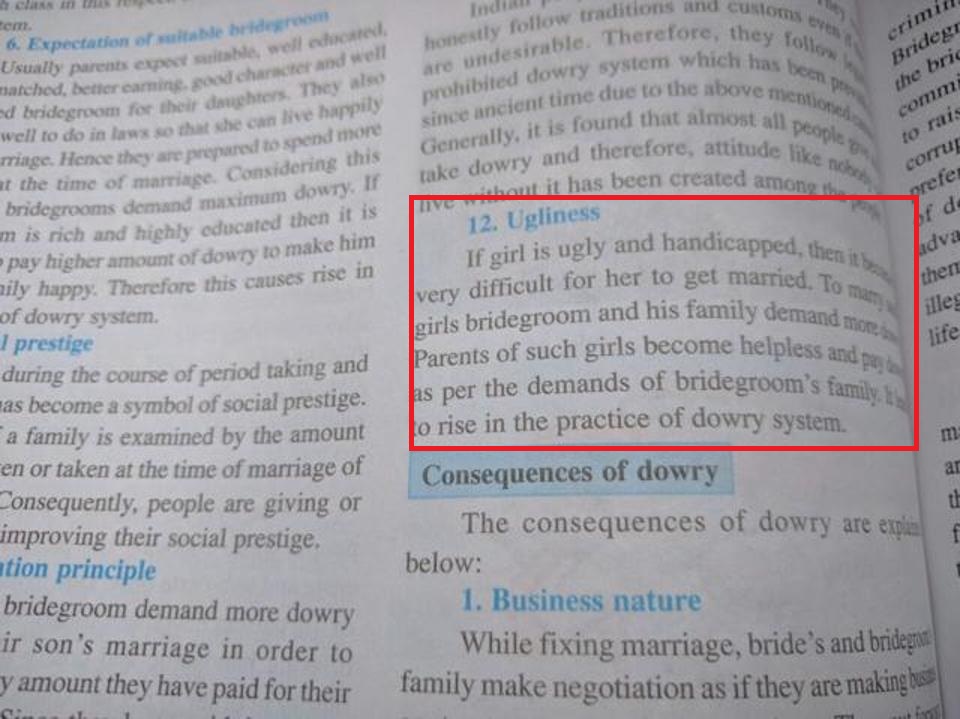 মেয়েরা ‘অসুন্দর’ হলে পণের দাবিও বাড়ে মন্তব্যের বইয়ের পৃষ্ঠাটি ছবি সামাজিক মাধ্যমের ব্যাপকভাবে ছড়িয়ে পড়ে। অনেকেই বলছেন, পাঠ্যপুস্তকে এই ধরনের মন্তব্য ভারতীয় সমাজের কুপ্রথাগুলোর অবসানে মোটেও সাহায্য করবে না।