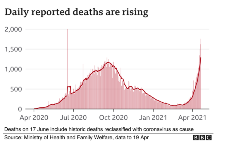 বিবিসির এক প্রতিবেদন বলা হয়েছে, গত ১৬ এপ্রিল থেকে প্রায় ৩৬ ঘণ্টা হাসপাতালে হাসপাতালে ঘুরে স্বামীর জন্য অক্সিজেন এমনকি কোন বেডের ব্যবস্থা করতে পারেনি এক নারী। পরে অক্সিজেন স্যাচুরেশন কমে হাসপাতালের বাইরেই মারা যান তার স্বামী।