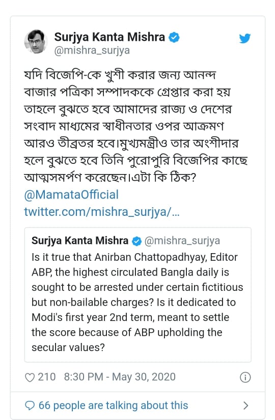 পশ্চিমবঙ্গের বাম নেতা সূর্যকান্ত মিশ্র এ নিয়ে এক টুইট বার্তায় বলেন, আনন্দবাজার পত্রিকার সম্পাদককে ডেকে নিয়ে পুলিশি জেরার মুখে হেনস্তা করা স্বাধীন সাংবাদিকতার ওপর একটি হামলা।