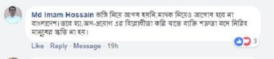 ‘জঙ্গি নিয়ে আপোষ হয়নি, মাদক নিয়েও আপোষ হবে না বাংলাদেশে। তবে হ্যাঁ,অপপ্রয়োগ এর বিরোধিতা করি যাতে ব্যক্তি শত্রুতা বশে নিরীহ মানুষের ক্ষতি না হয়,’ লিখেছেন ইমাম হোসেন।