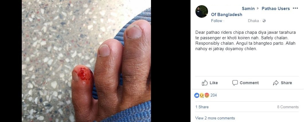 ফেসবুকে উবার ইউজার্স অব বাংলাদেশ গ্রুপে কয়েকজন চ্যানেল আই অনলাইনের করা পোস্টের মন্তব্যে জানান, বেশিরভাগ মোটরসাইকেল চালক নিজে হেলমেট পরলেও যাত্রীর জন্য হেলমেট রাখে না। অনেক চালক নামেমাত্র হেলমেট রাখলেও সেটা পরার যোগ্য নয়। মোটামুটি মোটরসাইকেল চালাতে পারে এমন রাইডারও পাওয়া যাচ্ছে। অদক্ষ ও বেপরোয়া মোটরসাইকেল চালকের কারণে দুর্ঘটনাও বেড়ে চলেছে।