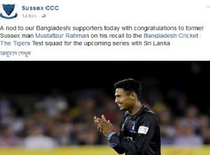 টেস্ট দলে ফেরায় মোস্তাফিজকে অভিনন্দন জানাতে সামাজিক যোগাযোগ মাধ্যমকে বেছে নিয়েছে ইংলিশ কাউন্টি ক্লাবটি। তাদের ভেরিফায়েড পেজে ফিজের ছবি পোস্ট করে লিখেছে, ‘আজ আমাদের বাংলাদেশি সমর্থকদের অভিনন্দন, সঙ্গে সাসেক্স খেলোয়াড় মোস্তাফিজুর রহমানকেও অভিনন্দন, শ্রীলঙ্কার বিপক্ষে আসন্ন টেস্ট সিরিজের বাংলাদেশ দলে ডাক পাওয়ার জন্য।’