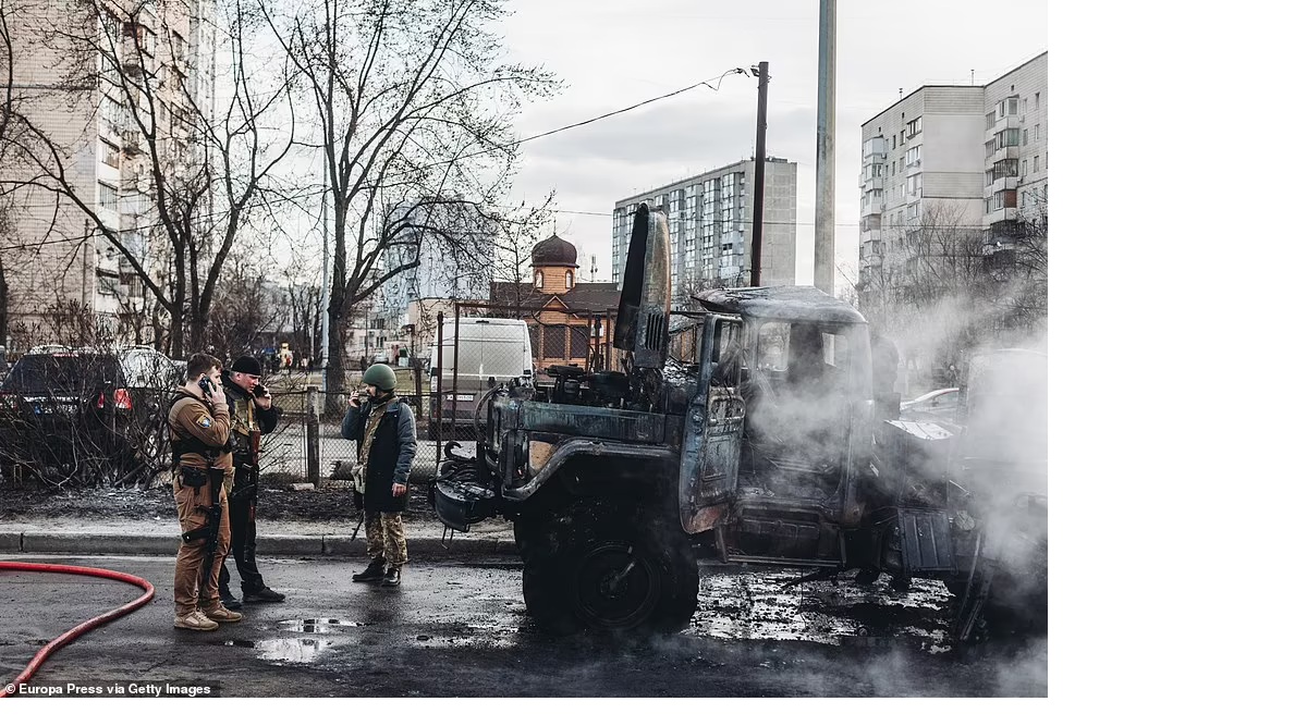 হামলায় পুড়ে যাওয়া সামরিক যানের সামনে ইউক্রেনের সেনারা।