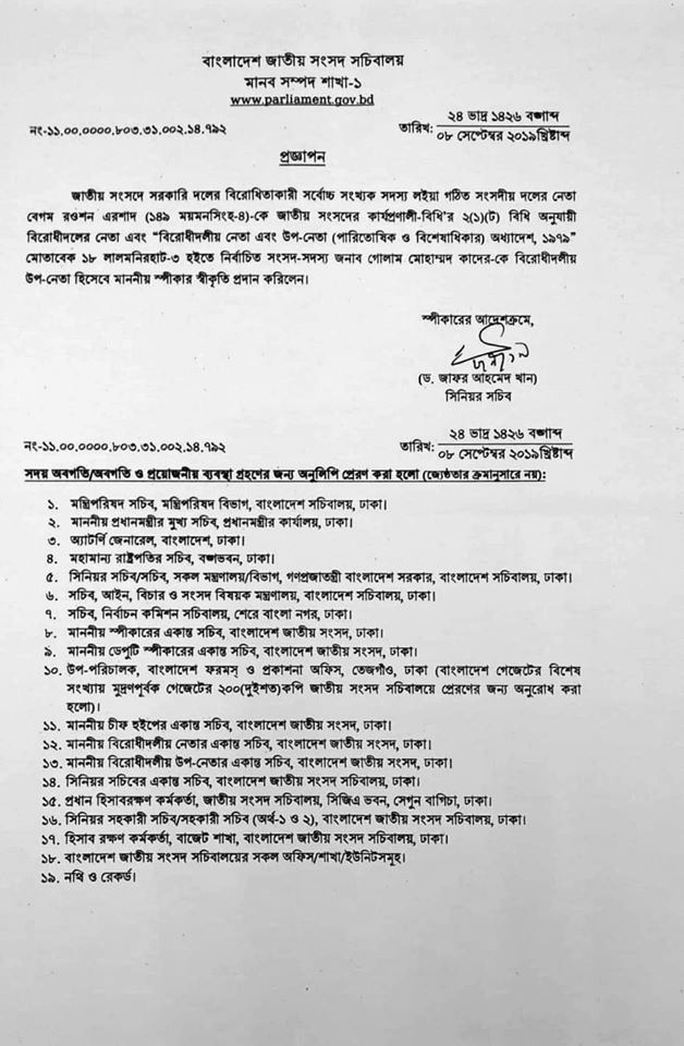 এতে বলা হয়, ‘জাতীয় সংসদে সরকারি দলের বিরোধিতাকারী সর্বোচ্চ সংখ্যক সদস্য নিয়ে গঠিত সংসদীয় দলের নেতা বেগম রওশন এরশাদ (১৪৯ ময়মনসিংহ-৪)-কে জাতীয় সংসদের কার্যপ্রণালী-বিধির ২(১)(ট) বিধি অনুযায়ী বিরোধী দলের নেতা এবং ‘বিরোধী দলীয় নেতা এবং উপ-নেতা (পারিতোষিক ও বিশেষাধিকার) অধ্যাদেশ, ১৯৭৯’ অনুসারে ১৮ লালমনিরহাট-৩ থেকে নির্বাচিত সংসদ সদস্য গোলাম মােহাম্মদ কাদেরকে বিরােধী দলীয় উপ-নেতা হিসেবে স্পিকার স্বীকৃতি প্রদান করলেন।