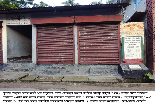 গত ১০ সেপ্টেম্বর, বেলা ১১টা। কথা হচ্ছিলো কুষ্টিয়া শহরের কোহিনুর ভিলার হালিম মল্লিক ও শিরু মল্লিকের সাথে। কুষ্টিয়া শহরের মধ্যে অবস্থিত বাড়িটিতে একাত্তর সালে গণহত্যা চালিয়ে ১৬ জনকে হত্যা করেছিলো স্বাধীনতা বিরোধী বিহারীরা। এ কারণে বাড়িটিকে রক্তবাড়ির ইতিহাস নামেও চেনে অনেকে।