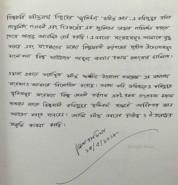 তিনি লিখেছেন: “বিশ্বকবি রবীন্দ্রনাথ ঠাকুরের স্মৃতিধন্য ‘রবীন্দ্র ভবন’-এ কবিগুরুর রচিত পাণ্ডুলিপি, পত্রাবলী এবং চিত্রকর্মের এক সুবিশাল ভাণ্ডার পরিদর্শন করতে পেরে অত্যন্ত আনন্দিত বোধ করছি। এ ভবনের সংগ্রহসমূহ আমাকে মুগ্ধ করেছে এবং সংরক্ষণের লক্ষ্যে বিশ্বভারতী কর্তৃপক্ষের গৃহীত উদ্যোগসমূহ বাংলা তথা বিশ্ব সাহিত্যের অমূল্য অবদান রক্ষায় প্রশংসার দাবিদার।