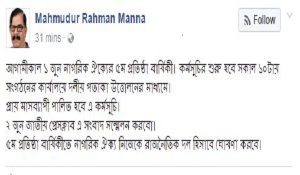 ফেসবুকে দেয়া এক স্ট্যাটাসে মাহমুদুর রহমান মান্না লিখেন, ‘আগামীকাল ১ জুন নাগরিক ঐক্যের ৫ম প্রতিষ্ঠা বার্ষিকী। কর্মসূচির শুরু হবে সকাল ১০টায় সংগঠনের কার্যালয়ে দলীয় পতাকা উত্তোলনের মাধ্যমে। প্রায় মাসব্যাপী পালিত হবে এ কর্মসূচি। ২ জুন জাতীয় প্রেসক্লাব এ সংবাদ সম্মেলন করবো।