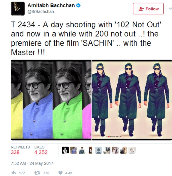 প্রিমিয়ারে উপস্থিতি ছাড়াও অমিতাভ তার টুইটারে বলেন: গতরাতে ‘শচিন: এ বিলিয়ন ড্রিমস’ দেখার সৌভাগ্য হল। আমি খুব গর্বিত এবং আবেগে আপ্লুত’। ডেকান ক্রনিকেল