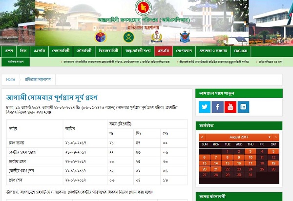 এই সূর্যগ্রহণ বিষয়ে আন্তঃবাহিনী জনসংযোগ পরিদফতর (আইএসপিআর) এক সংবাদ বিজ্ঞপ্তিতে জানানো হয়, বাংলাদেশ থেকে এ পূর্ণগ্রাস সূর্য গ্রহণ দেখা যাবে না। যুক্তরাষ্ট্রের হাওয়াইয়ে স্থানীয় সময় ভোর ৫টা ৩৪ মিনিটে গ্রহণ শুরু হবে (বাংলাদেশ সময় রাত ৯টা ৪৭ মিনিট)। বাংলাদেশে গ্রহণ শেষ হবে রাত ৩টা ৪ মিনিটে। আইএসপিআর থেকে গ্রহণের একটি গতিপথও নির্দেশ করে দেওয়া হয়েছে।