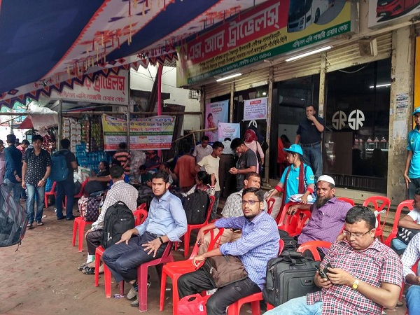সেখানেও জায়গা না পেয়ে ফুটপাথ ঘেষে ব্যাগ-লাগেজকেই আসন বানিয়ে পরিবার নিয়ে বাসের অপেক্ষা করছেন বেসরকারি প্রতিষ্ঠানের কর্মকর্তা জাকিরুল ইসলাম। বিকাল ৩ টার হানিফ পরিবহনের বাসে গাইবান্ধা যাচ্ছেন তারা। বাড়তি ভাড়া বা অন্যকোন ভোগান্তির মুখে না পড়লেও রাস্তায় যানজটের সম্ভাবনা নিয়েই শঙ্কিত তিনি।