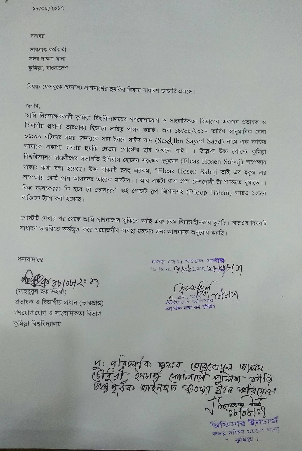 শুক্রবার প্রকাশ্যে আসা এক ফেসবুক পোস্টে সাদ ইবনে সাইদ সাদ নামে নজরুল ইসলাম হল ছাত্রলীগের সক্রিয় ওই কর্মী শিক্ষক তারেককে উদ্দেশ্য করে লেখেন: “ইলিয়াস হোসেন সবুজ ভাইয়ের হুকুমের অপেক্ষায় বেঁচে গেল আলবদর তারেক মাস্টার।। আর একটা রাত পেল দেশদ্রোহীটা শান্তিতে ঘুমাতে।। কিন্তু কালকে??? কি হবে রে তোর???”