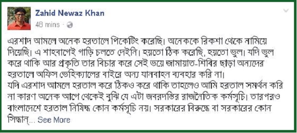 অতীত জীবনের অভিজ্ঞতা এবং আজকের বাংলাদেশ পরিস্থিতি নিয়ে তিনি লিখেছেন: ‘এরশাদ আমলে অনেক হরতালে পিকেটিং করেছি। অনেককে রিকশা থেকে নামিয়ে দিয়েছি। এ শাহবাগেই গাড়ি চলতে দেইনি। হয়তো ঠিক করেছি, হয়তো ভুল। যদি ভুল করে থাকি আর প্রকৃতি তার বিচার করে সেই ভয়ে জামায়াত-শিবির ছাড়া অন্যদের হরতালে অফিস ভেহিক্যালের বাইরে অন্য যানবাহন ব্যবহার করি না।