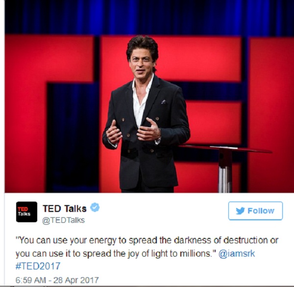 ‘টেড টক’ টুইটারে হ্যাশ ট্যাগে শাহরুখ খানের ছবির সাথে পোস্ট করে, ‘নিজের শক্তিকে আপনি কোনো কিছু ধ্বংস করতেও ব্যবহার করতে পারেন, আবার লক্ষ লক্ষ মানুষের কাছে আলো ছড়িয়ে দেওয়ার জন্যও ব্যবহার করতে পারেন।’ হিন্দুস্তান টাইমস।