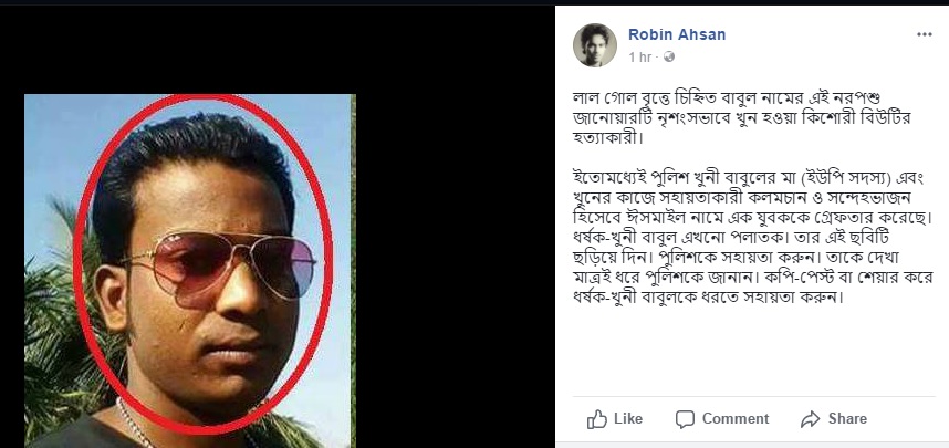 বাবুলের ছবি শেয়ার দিয়ে প্রকাশক ও অনলাইন অ্যাক্টিভিষ্ট রবিন আহসান ফেসবুকে লিখেছেন: লাল গোল বৃত্তে চিহ্নিত বাবুল নামের এই নরপশু জানোয়ারটি নৃশংসভাবে খুন হওয়া কিশোরী বিউটির হত্যাকারী। ইতোমধ্যেই পুলিশ খুনী বাবুলের মা (ইউপি সদস্য) এবং খুনের কাজে সহায়তাকারী কলমচান ও সন্দেহভাজন হিসেবে ঈসমাইল নামে এক যুবককে গ্রেপ্তার করেছে। ধর্ষক-খুনী বাবুল এখনো পলাতক। তার এই ছবিটি ছড়িয়ে দিন। পুলিশকে সহায়তা করুন। তাকে দেখা মাত্রই ধরে পুলিশকে জানান। কপি-পেস্ট বা শেয়ার করে ধর্ষক-খুনী বাবুলকে ধরতে সহায়তা করুন।