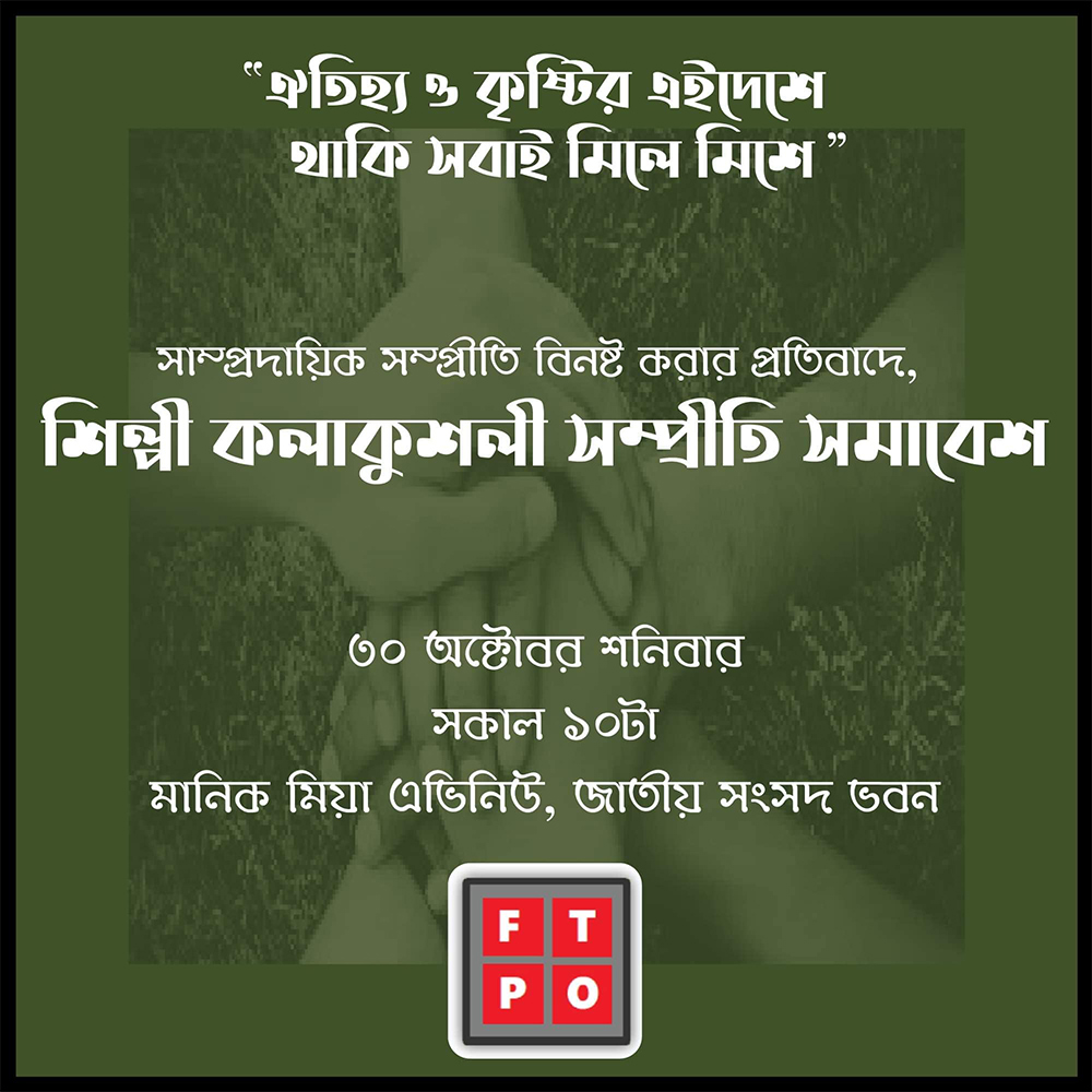 তিনি জানান, ‘ঐতিহ্য ও কৃষ্টির এই দেশে, থাকি সবাই মিলেমিশে’-এই শ্লোগান নিয়ে ৩০ অক্টোবর একটি বড় সমাবেশের আয়োজন করছে এফটিপিও। ওইদিন সকাল ১০টা থেকে ১২টা পর্যন্ত জাতীয় সংসদের সামনে (মানিক মিয়া এভিনিউ) এই সমাবেশ অনুষ্ঠিত হবে।