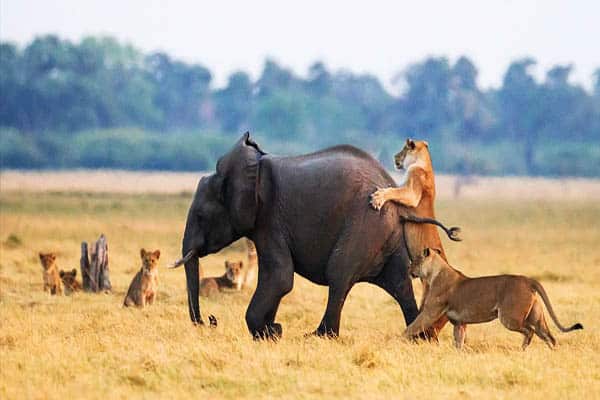 চবী জাতীয় ন্যাশনাল পার্কে একটি শিশু হাতির উপর হামলা করে দুই সিংহী। প্রাপ্তবয়স্ক হাতির দল শিশু হাতিরটির আশেপাশে প্রতিরক্ষা বৃত্ত গড়ে তাকে রক্ষা করে। ব্রিটিশ ফটোগ্রাফার জেমস গিফফোর্ডের এই অবিশ্বাস্য ছবিগুলো তোলেন।