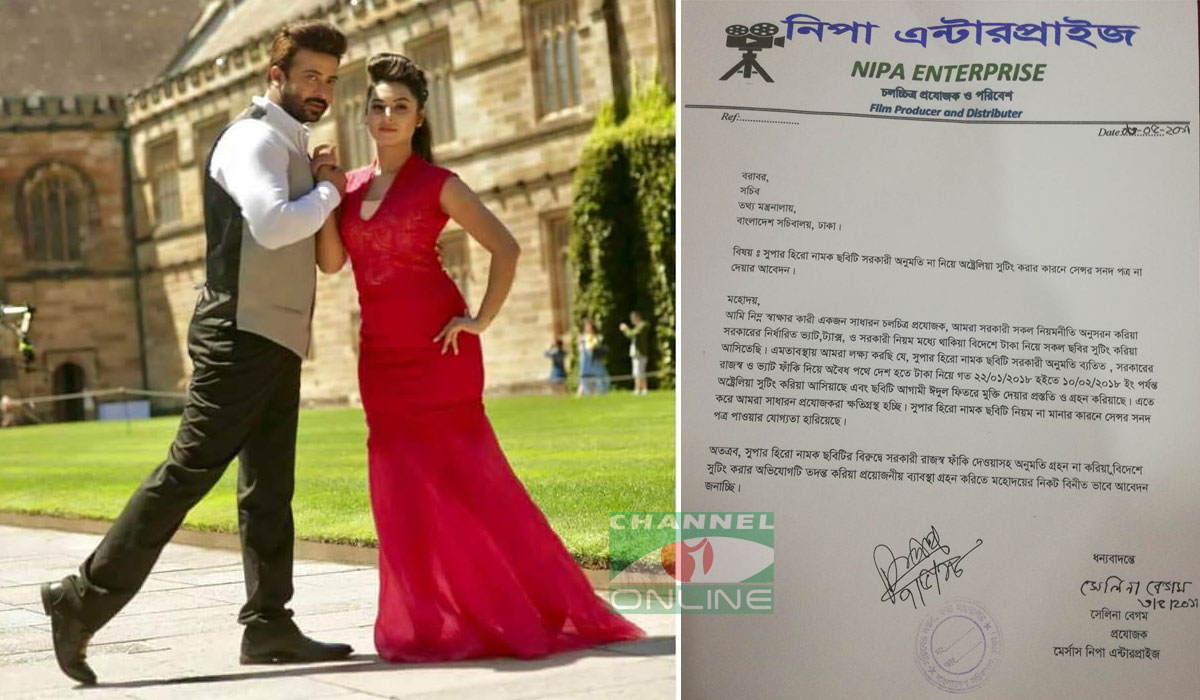 ‘সুপার হিরো’ ছবির সেন্সর ঠেকাতে জমা দেয়া ওই চিঠিতে বলা হয়েছে, ‘সুপার হিরো’ নামক ছবিটি সরকারি অনুমতি (ওয়ার্ক পারমিট) না নিয়ে অস্ট্রেলিয়াতে শুটিং করা হয়েছে। সেজন্য যেন এই ছবির সেন্সর সনদ পত্র না দেয়া হয়। চিঠিতে লিখিতভাবে আবেদন করা হয় এভাবে, ‘সুপার হিরো’ নামক ছবিটি সরকারি অনুমতি ব্যতিত সরকারের রাজস্ব, ভ্যাট ফাঁকি দিয়ে অবৈধ পথে দেশ হতে টাকা নিয়ে গত ২২ জানুয়ারি ২০১৮ থেকে ১০ ফেব্রুয়ারি ২০১৮ পর্যন্ত অস্ট্রলিয়াতে শুটিং করেছে।