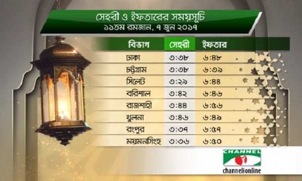 ঢাকায় সেহরি ভোর ৩টা ৩৮মি. ও ইফতার সন্ধ্যা ৬টা ৪৮মি.। চট্টগ্রামে সেহরি ভোর ৩টা ৩৮মি. ও ইফতার সন্ধ্যা ৬টা ৩৯মি.। সিলেটে সেহরি ভোর ৩টা ২৯মি. ও ইফতার সন্ধ্যা ৬টা ৪৪মি.। বরিশালে সেহরি ভোর ৩টা ৪২মি. ও ইফতার সন্ধ্যা ৬টা ৪৬মি.। রাজশাহীতে সেহরি ভোর ৩টা ৪৪মি. ও ইফতার সন্ধ্যা ৬টা ৫৬মি.। খুলনায় সেহরি ভোর ৩টা ৪৬মি. ও ইফতার সন্ধ্যা ৬টা ৪৯মি.। রংপুরে সেহরি ভোর ৩টা ৩৭মি. ও ইফতার সন্ধ্যা ৬টা ৫৭মি.। ময়মনসিংহে সেহরি ভোর ৩টা ৩৬মি. ও ইফতার সন্ধ্যা ৬টা ৫০মি.।