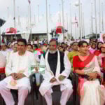 মুক্তিযুদ্ধ বিষয়ক মন্ত্রী আ ক ম মোজাম্মেল হক (মাঝে) পয়লা বৈশাখের গান শুনছেন