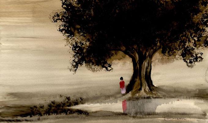 জীবনের মধ্য দুপুরে মানুষের কোন ছায়া থাকে না। হুমায়ূনের আঁকা ছবিতেও এসেছে সে মধ্যাহ্নের গল্প। নিপাট ঝকঝকে দুপুরে দাড়িয়ে আছে একলা মানুষ আর বৃক্ষ। পাশে মেঘের মতো সাদা প্রকৃতি।