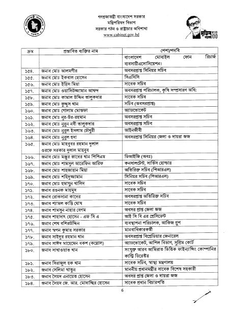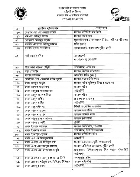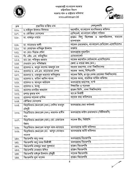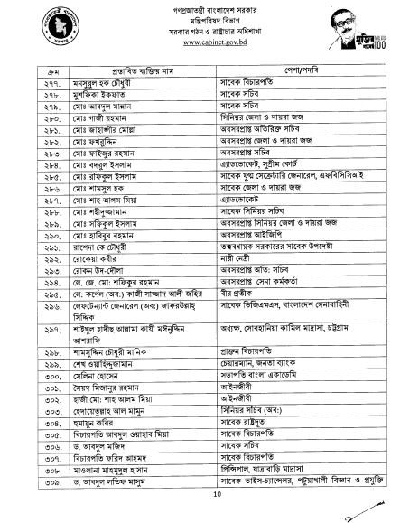 এছাড়াও রয়েছেন: সাবেক ভিসি রংপুর বেগম রোকেয়া বিশ্ববিদ্যালয় প্রফেসর ড. নাজমুল আহসান কলিমুল্লাহ, সাবেক তথ্য কমিশনার প্রফেসর সাদেকা হালিম, ফৌজিয়া মোসলেম, প্রাক্তন বিচারপতি নাজমুন আরা সুলতানা, সাবেক প্রধান বিচারপতি সৈয়দ মাহমুদ হোসেন, ফ্যাশান ডিজাইনার বিবি রাসেল, মুক্তিযোদ্ধা শমসের কবির চৌধুরী, বিচারপতি (অব.) কৃষ্ণা দেবনাথ, মেজর জেনারেল মোহাম্মদ আলী সিকদার( অব:), সাবেক সেনা প্রধান মেজর জেনারেল হারুনুর রশীদ (অব:), অবসর প্রাপ্ত মন্ত্রী পরিষদ সচিব মো. মোশারফরফ হোসেন ভূঁইয়া, তত্বাবধায়ক সরকারের সাবেক উপদেষ্টা রাশেদা কে চৌধুরী, নারী নেত্রী রোকেয়া কবীর, লে. কর্ণেল কাজী সাজ্জাদ আলী জহির( অব:), প্রাক্তন বিচারপতি শামসুদ্দিন চৌধুরী মানিক, বাংলা একাডেমির সভাপতি সেলিনা হোসেন, অবসরপ্রাপ্ত সিনিয়র সচিব হেদায়েতুল্লাহ আল মামুন, সাবেক বিচারপতি আবদুল ওয়াহাব মিয়া এবং এয়ার চিফ মার্শাল (অব.) ফখরুল আজম।