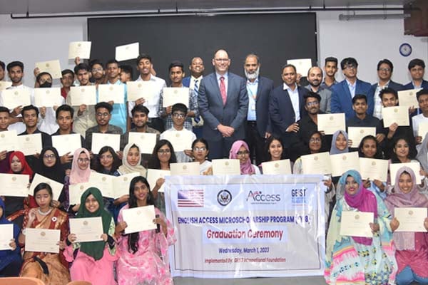 শিক্ষার্থীদের ইংরেজি ভাষা, বিশ্লেষণী-চিন্তা ও নেতৃত্বের দক্ষতা শক্তিশালী করার লক্ষ্যে ঢাকা ও সিলেটের ১০০ শিক্ষার্থী মার্কিন সরকারের অর্থায়নে ইংলিশ ‘এক্সেস মাইক্রোস্কলারশিপ প্রোগ্রাম’ কোর্স সম্পন্ন করেছেন। গ্লোবাল এডুকেটরস ইনিশিয়েটিভ ফর সাসটেইনেবল ট্রান্সফরমেশন (GEIST) ইন্টারন্যাশনাল ফাউন্ডেশন এ কোর্স পরিচালনা করেছে।