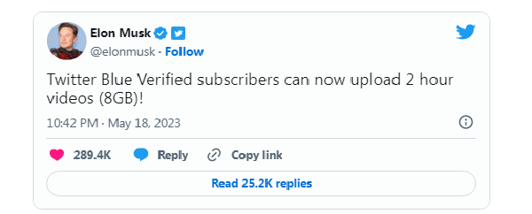 ইলন মাস্ক ঘোষণা দিয়েছেন, মাইক্রোব্লগিং সাইট ‘টুইটার ব্লু’ এর ভেরিফাইড গ্রাহকরা এখন থেকে ২ ঘণ্টার (৮ জিবি) দীর্ঘ ভিডিও আপলোড করতে পারবেন।