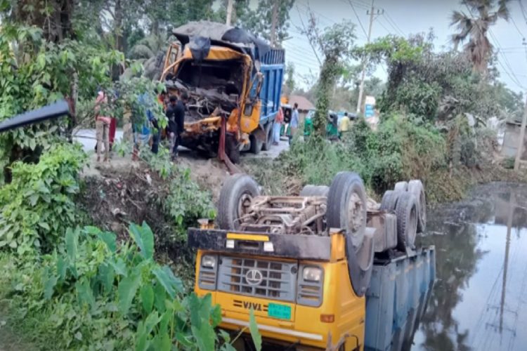 স্থানীয় সূত্রে জানা গেছে, রাতে লক্ষ্মীপুর থেকে ছেড়ে আসা বালুবাহী একটি ড্রাম ট্রাক চাকা পাংচার হলে নাজিরপুর এলাকায় এসে দাঁড়ায়। ভোর ৪টার দিকে একই দিক থেকে বালু নিয়ে দ্রুত গতিতে আসা আরেকটি ড্রাম ট্রাক নাজিপুর এলাকায় পৌঁছলে পিছন থেকে দাঁড়িয়ে থাকা আগের চাকা পাংচার ট্রাকটিকে ধাক্কা দিলে সেটি উল্টে পাশের খাদে পড়ে যায়। এসময় দ্রুত গতির গাড়ির হেলপার সজিব ও চালকের বন্ধু সাকিব ও অজ্ঞাত চালক গুরুত্বর আহত হয়।