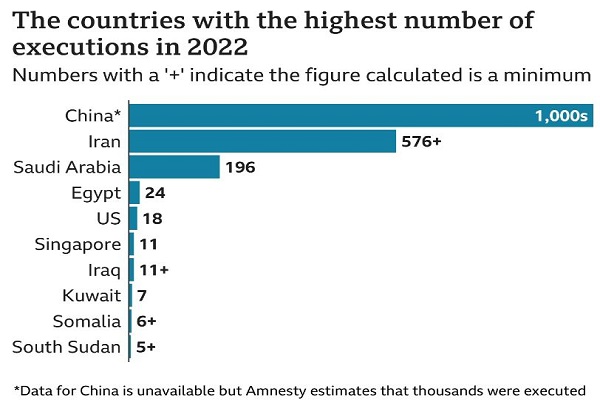 বিবিসি জানিয়েছে, অ্যামনেস্টি ইন্টারন্যাশনালের বার্ষিক পর্যালোচনা অনুসারে, ২০২২ সালে ২০টি দেশে মোট ৮৮৩ জনকে মৃত্যুদণ্ড দেওয়া হয়েছে বলে জানা গেছে। যা ২০২১ সালের তুলনায় ৫৩% বেশি। এর মধ্যে ইরান, সৌদি আরব এবং মিশর একাই ৯০% মৃত্যুদণ্ড কার্যকর করেছে। তবে এই পরিসংখ্যান থেকে চীনকে বাদ দেয়া হয়েছে কারণ প্রতি বছর দেশটিতে হাজার হাজার মৃত্যুদণ্ড কার্যকর করা হয় বলে ধারণা করা হচ্ছে।