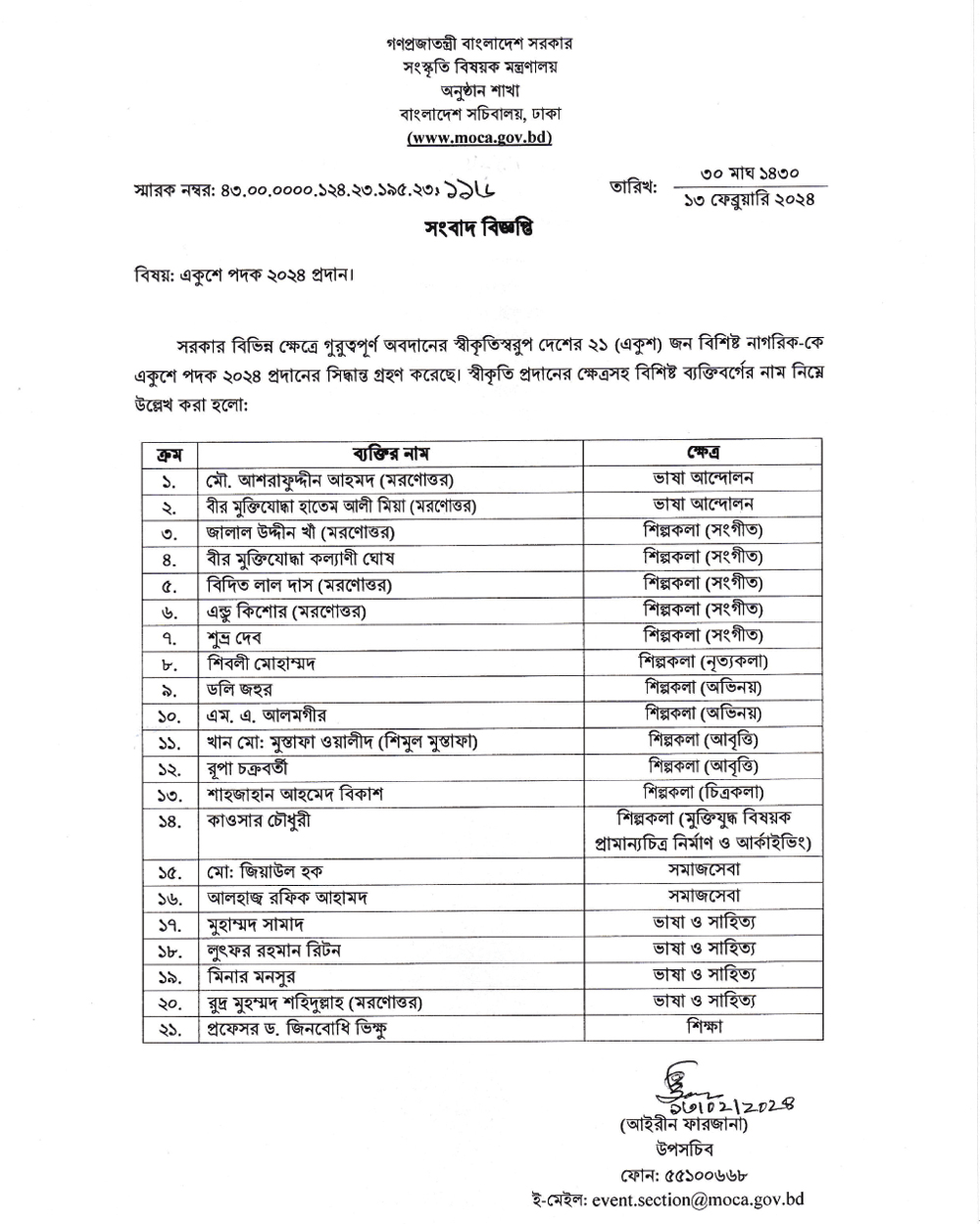 রাষ্ট্রের বিভিন্ন ক্ষেত্রে গুরুত্বপূর্ণ অবদানের স্বীকৃতিস্বরূপ দেশের ২১ জন বিশিষ্ট নাগরিককে ‘একুশে পদক-২০২৪’ প্রদানের সিদ্ধান্ত গ্রহণ করেছে বাংলাদেশ সরকার।
