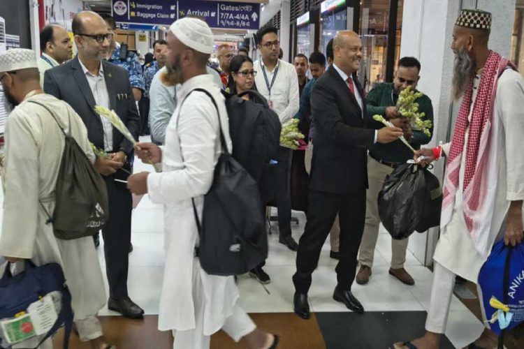 বিমানবন্দরে হাজিদের ফুল দিয়ে স্বাগত জানান বেসামরিক বিমান চলাচল কর্তৃপক্ষের (বেবিচক) চেয়ারম্যান এয়ার ভাইস মার্শাল মো. মঞ্জুর কবীর ভূঁইয়া। এ সময় উপস্থিত ছিলেন হজ ব্যবস্থাপনায় যুক্ত বিভিন্ন সংস্থা ও প্রতিষ্ঠানের কর্মকর্তারা।