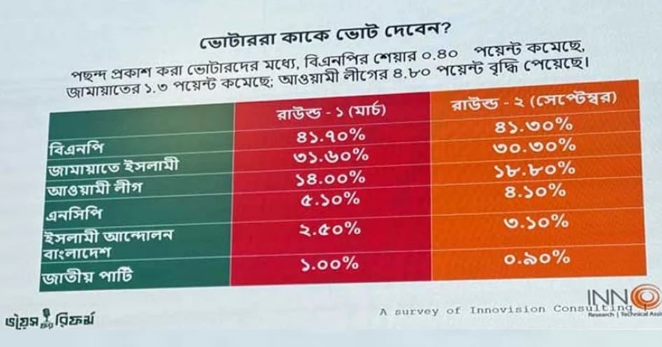 ইনোভিশন কনসালটিং নামে একটি বেসরকারি গবেষণা সংস্থার মাঠপর্যায়ের সেপ্টেম্বর মাসের জরিপে এ তথ্য উঠে এসেছে। আগামী নির্বাচন নিয়ে দেশের সব জেলায় ১০ হাজার ৪১৩ জন মানুষের ওপর জরিপ চালায় পরামর্শক প্রতিষ্ঠান ইনোভিশন কনসাল্টিং।