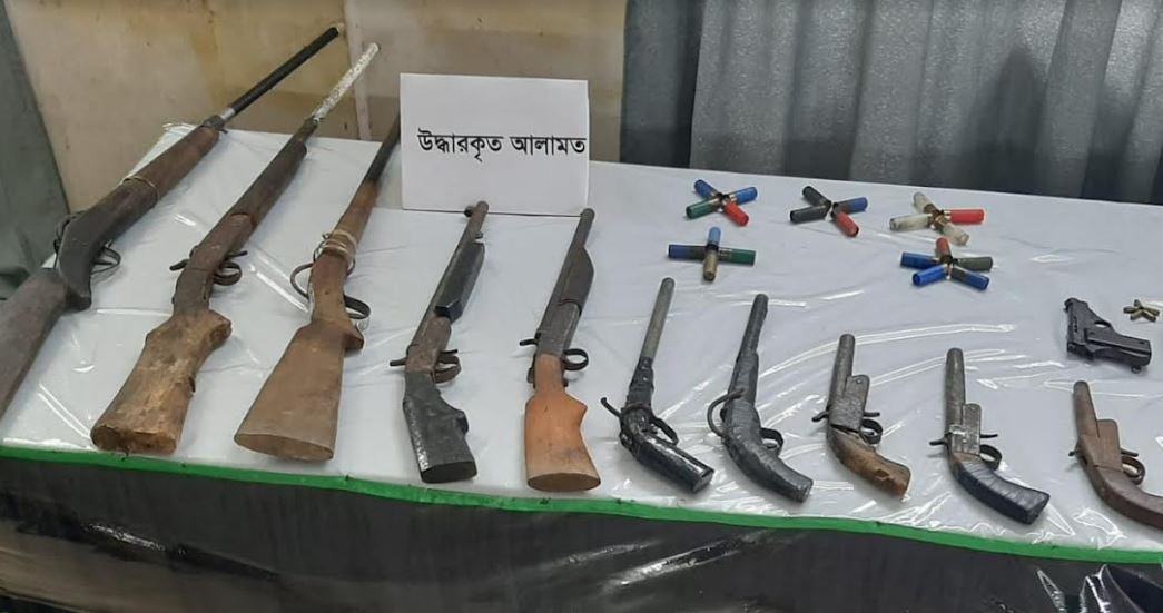 র্যাবের তথ্যানুযায়ী- গ্রেফতারদের থেকে বিদেশি পিস্তল, পাঁচ রাউন্ড গুলি, দেশীয় তৈরি তিনটি একনালা বড় বন্দুক, দু’টি একনালা মাঝারি বন্দুক, ছয়টি একনালা ছোট বন্দুকসহ মোট ১১টি দেশীয় তৈরি বন্দুক, ১৭ রাউন্ড তাজা কার্তুজ, চার রাউন্ড খালি কার্তুজ, দু’টি ছুরি ও ছয়টি দেশীয় তৈরি দা উদ্ধার করা হয়।
