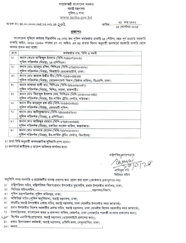 চাকরির বয়স ২৫ বছর পূর্ণ হওয়ায় বাংলাদেশ পুলিশের ৯ জন কর্মকর্তাকে বাধ্যতামূলক অবসরে পাঠিয়েছে সরকার।