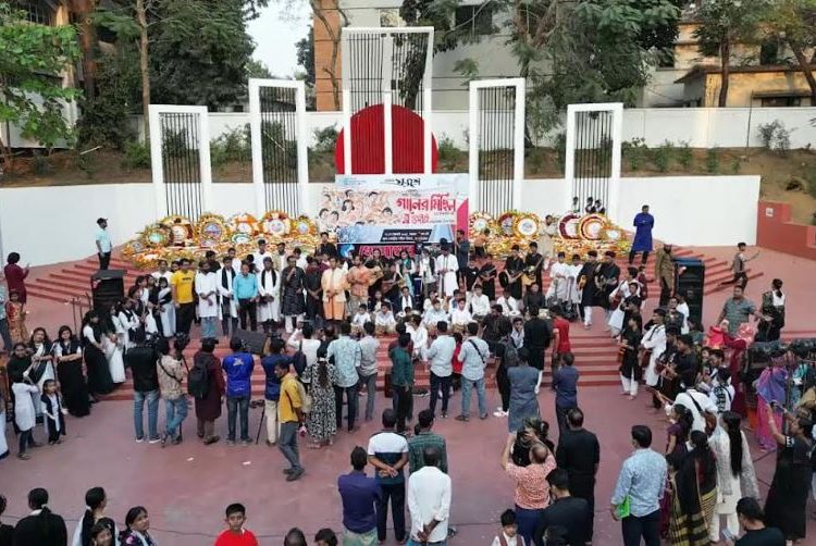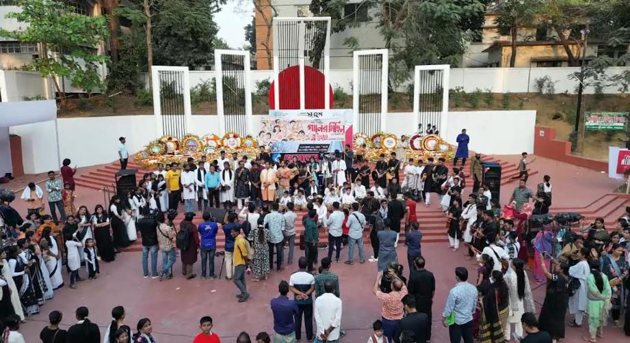 শত শিল্পীর কণ্ঠে অমর একুশের গানের সাথে গিটার, বাঁশি, মৃদঙ্গ ও ঢোলের তালে সম্মিলিত সুরের মিছিলটি প্রধান সড়ক প্রদক্ষিণ করে পুরাতন শহীদ মিনারে জড়ো হয়। পরে সেখানে একুশের গান আর দেশাত্বকবোধক গানের সাথে শিল্পীরা নৃত্য পরিবেশন করে।