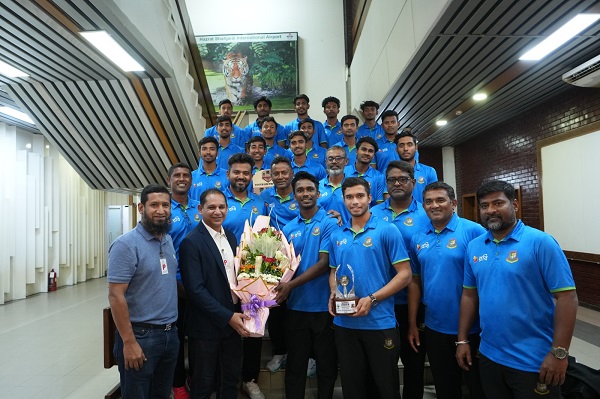 জিম্বাবুয়েতে ত্রিদেশীয় ওয়ানডে সিরিজ জিতে মঙ্গলবার দেশে ফিরেছে টাইগার অনূর্ধ্ব-১৯ দল। ঢাকায় যুবাদের ফুলেল স্বাগত জানান বাংলাদেশ ক্রিকেট বোর্ডের হেড অব গেম ডেভেলপমেন্ট হাবিবুব বাশার। সিরিজটিতে অংশ নেয় স্বাগতিক জিম্বাবুয়ে, বাংলাদেশ ও সাউথ আফ্রিকা।