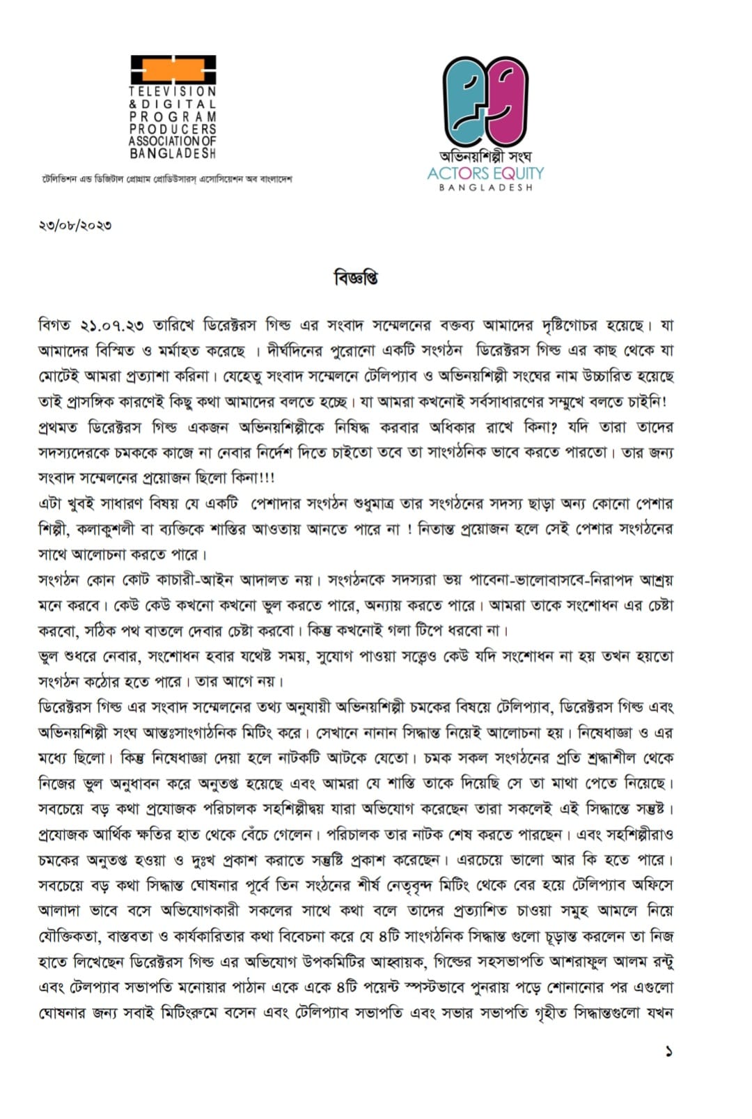 বুধবার দুপুরে এক বিজ্ঞপ্তিতে অভিনয়শিল্পী সংঘ জানায়,“ডিরেক্টরস গিল্ড এর সংবাদ সম্মেলনের বক্তব্য আমাদের দৃষ্টিগোচর হয়েছে। যা আমাদের বিস্মিত ও মর্মাহত করেছে । দীর্ঘদিনের পুরোনো একটি সংগঠন ডিরেক্টরস গিল্ড এর কাছ থেকে যা মোটেই আমরা প্রত্যাশা করি না। যেহেতু সংবাদ সম্মেলনে টেলিপ্যাব ও অভিনয়শিল্পী সংঘের নাম উচ্চারিত হয়েছে তাই প্রাসঙ্গিক কারণেই কিছু কথা আমাদের বলতে হচ্ছে। যা আমরা কখনোই সর্বসাধারণের সম্মুখে বলতে চাইনি!”