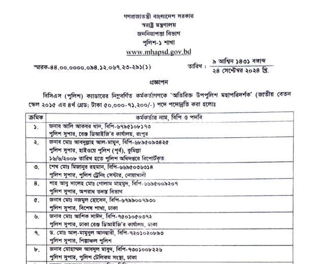 অতিরিক্ত উপ-পুলিশ মহাপরিদর্শক (অতিরিক্ত ডিআইজি) পদে (গ্রেড-৪) পদোন্নতি পেয়েছেন পুলিশ সুপার পদমর্যাদার ৪৭ কর্মকর্তা।