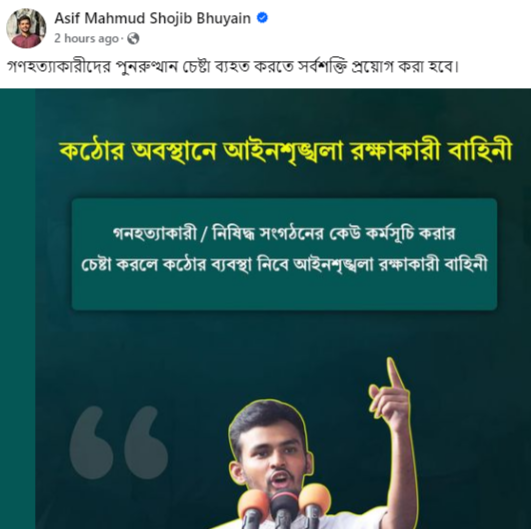 উপদেষ্টা আসিফ মাহমুদ লিখেছেন, গণহত্যাকারী ও নিষিদ্ধ সংগঠনের কেউ কর্মসূচি করার চেষ্টা করলে কঠোর ব্যবস্থা নেবে আইনশৃঙ্খলা রক্ষাকারী বাহিনী।