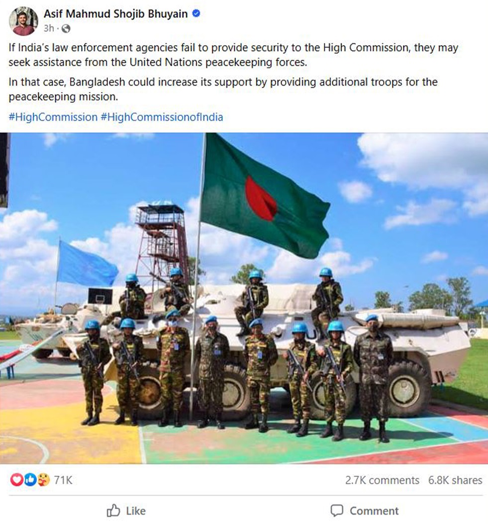 সোমবার (২ ডিসেম্বর) রাতে নিজের ফেসবুকে এক পোস্টে যদি ভারতের আইন প্রয়োগকারী সংস্থা হাইকমিশনকে নিরাপত্তা দিতে ব্যর্থ হয়, তাহলে ভারতকে জাতিসংঘ শান্তিরক্ষা বাহিনীর সাহায্য চাইতে পরামর্শ দিয়েছেন উপদেষ্টা আসিফ মাহমুদে।