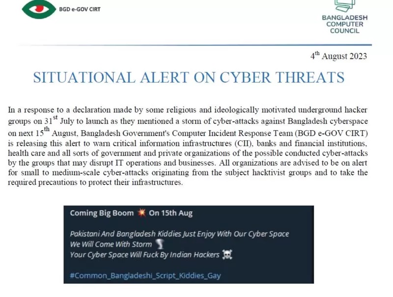 সার্ট এর এক বিজ্ঞপ্তিতে বলা হয়েছে, ওই হ্যাকার গ্রুপটি ধর্মীয় উগ্রবাদে উদ্বুদ্ধ এবং তারা ১৫ আগস্ট ‘সাইবার হামলার ঝড় বইয়ে দেয়ার হুমকি’ দিয়েছে।