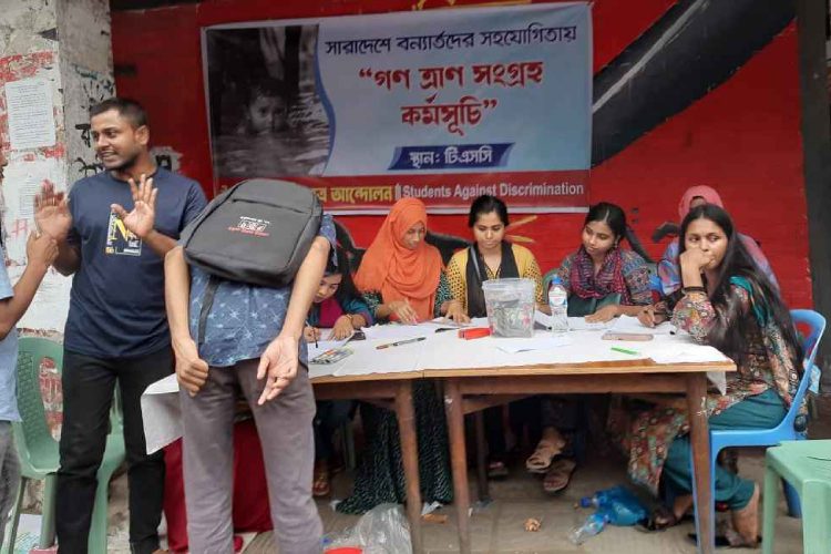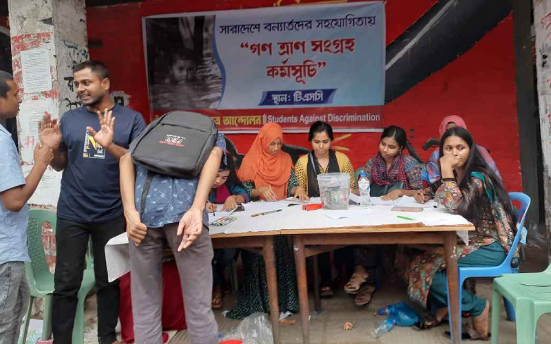 টিএসসিতে দেখা গেছে বন্যার্তদের জন্য বৈষম্যবিরোধী ছাত্র আন্দোলনের ত্রাণ কার্যক্রমে অংশ নিতে সামর্থ্য অনুযায়ী নগদ অর্থ কিংবা ত্রাণপণ্য নিয়ে আসছেন সব বয়সী মানুষ। টিএসসি জুড়ে বিরামহীন ভাবে কাজ করছেন ১০০ জনের বেশি স্বেচ্ছাসেবী।