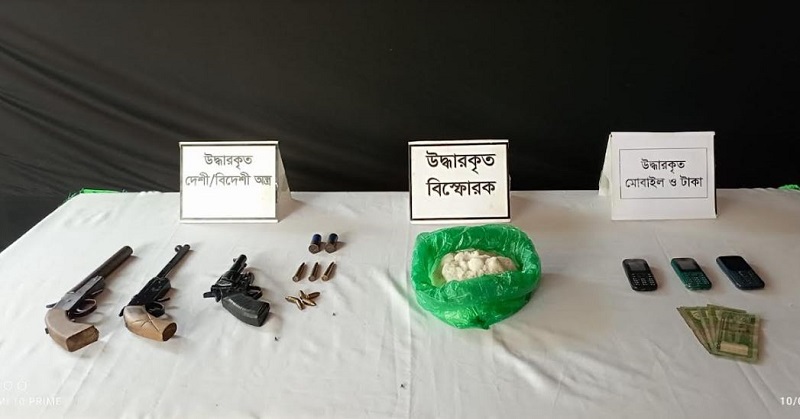 অভিযানে উদ্ধার হয়েছে বিদেশী ১ টি পিস্তল, দেশীয় তৈরি ২ টি বন্দুক, ১০ টি কার্তুজ, ২ কেজি বিস্ফোরক দ্রব্য, ৩ টি মোবাইল ফোন এবং নগদ আড়াই হাজার টাকা।
