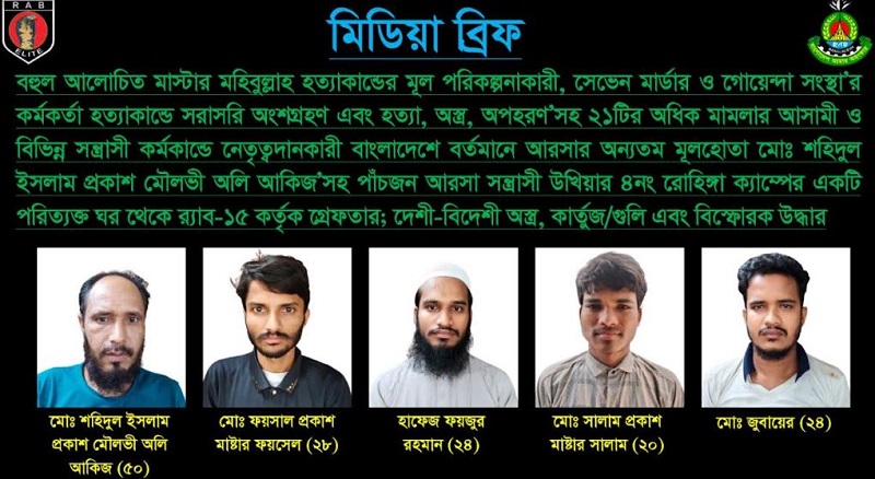 গ্রেপ্তাররা হলেন: উখিয়া উপজেলার ৫ নম্বর ক্যাম্পের মৃত আবুল বাশারের ছেলে মো. শহিদুল ইসলাম ওরফে মৌলভী অলি আকিজ (৫০), ৬ নম্বর ক্যাম্পের মৌলভী আনোয়ারের ছেলে মো. ফয়সাল ওরফে মাস্টার ফয়সেল (২৮), ২০ নম্বর ক্যাম্পের মৃত মৌলভী রহমত উল্লাহর ছেলে হাফেজ ফয়জুর রহমান (২৪), ৮ নম্বর ক্যাম্পের মৃত করিম উল্লাহর ছেলে মো. সালাম ওরফে মাস্টার সালাম (২০), ২২ নম্বর ক্যাম্পের আনু মিয়ার ছেলে মো. জুবায়ের (২৪)।
