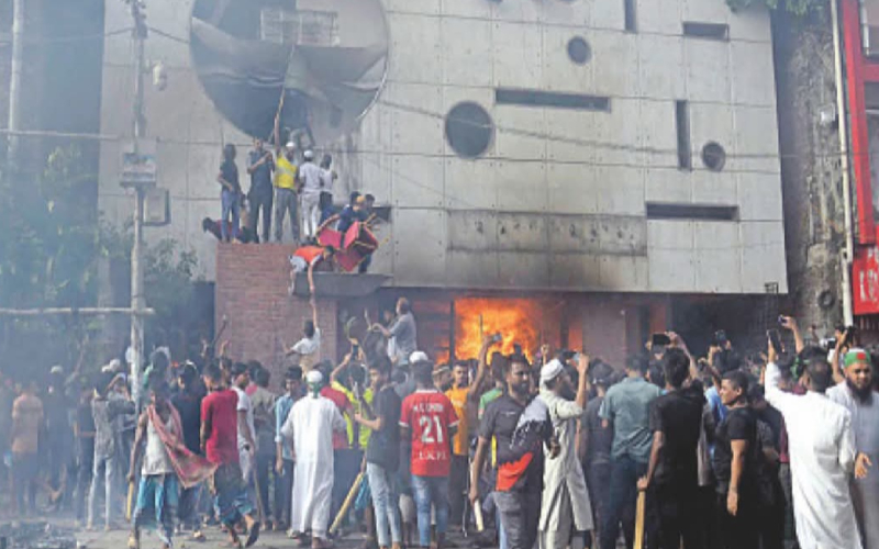 আওয়ামী লীগকে নিষিদ্ধ করা এবং ১৭ তারিখের রায়ে শেখ হাসিনাসহ তিন আসামির সর্বোচ্চ শাস্তির দাবিতে বিক্ষোভ করেন তারা। এক পর্যায়ে ভবনের ভেতরের পরিত্যক্ত আসবাব একসাথে করে আগুন ধরিয়ে দেন বিক্ষোভকারীরা। এসময় তারা বাইরে থাকা ভাস্কর্য ভাঙচুর করেন।
