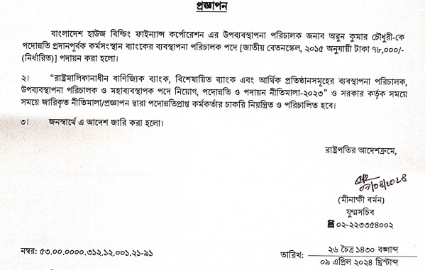 এতে বলা হয়, ‘ রাষ্ট্রীয় মালিকানাধীন বাণিজ্যিক ব্যাংক, বিশেষায়িত ব্যাংক এবং আর্থিক প্রতিষ্ঠানসমূহের ব্যবস্থাপনা পরিচালক, উপব্যবস্থাপনা পরিচালক ও মহাব্যবস্থাপক পদে নিয়োগ, পদোন্নতি ও পদায়ন নীতিমালা-২০২৩ ও সরকারের জারিকরা নীতিমালা/ প্রজ্ঞাপন অনুযায়ী পদোন্নতিপ্রাপ্ত কর্মকর্তার চাকরি নিয়ন্ত্রিত ও পরিচালিত হবে।
