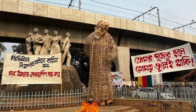চলতি বছর ১৪ ফেব্রুয়ারি বাংলাদেশে সাম্প্রতিক সেন্সরশিপ ও নিপীড়নের ঘটনার প্রতিবাদে ঢাবির চারুকলা অনুষদের কয়েকজন শিক্ষার্থীর উদ্যোগে ঢাকা বিশ্ববিদ্যালয়ের রাজু ভাস্কর্যের পাদদেশে প্রতিবাদী রবীন্দ্রনাথ ঠাকুরের ভাস্কর্য স্থাপন করা হয়। ভাস্কর্যটির মুখ টেপ দিয়ে বন্ধ করা ও হাতে রাখা গীতাঞ্জলিতে পেরেক বিদ্ধ দেখানো হয়।
