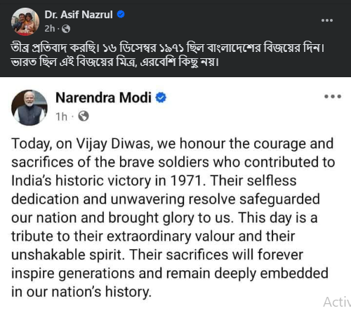 স্ট্যাটাসে আইন উপদেষ্টা লিখেন, তীব্র প্রতিবাদ করছি। ১৬ ডিসেম্বর ১৯৭১ ছিল বাংলাদেশের বিজয়ের দিন। ভারত ছিল এই বিজয়ের মিত্র, এর বেশি কিছু নয়।